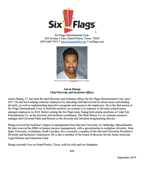 - News ReleaseThis is a news release written for a hypothetical situation where I played the role of the Public Relations Director for Six Flags Entertainment Corp. In this scenario, Six Flags was announcing that they hired a new Diversity and Inclusion Officer