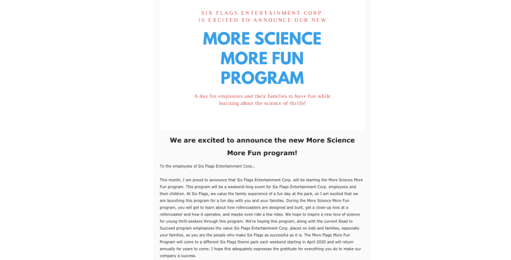 - News ReleaseThis is a news release written for a hypothetical situation where I played the role of the Public Relations Director for Six Flags Entertainment Corp. In this scenario, Six Flags was announcing that they hired a new Diversity and Inclusion Officer