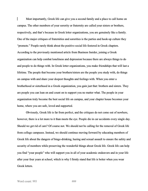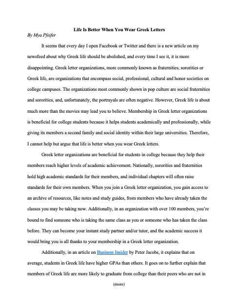 - Op-EdThis is an op-ed written about Greek letter organizations on university campuses. I discussed how Greek life has gotten a bad reputation from the headline stories about the worst of the worst situations, but those are the exceptions. I argue that Greek life is not as bad as it seems and joining it actually has many benefits