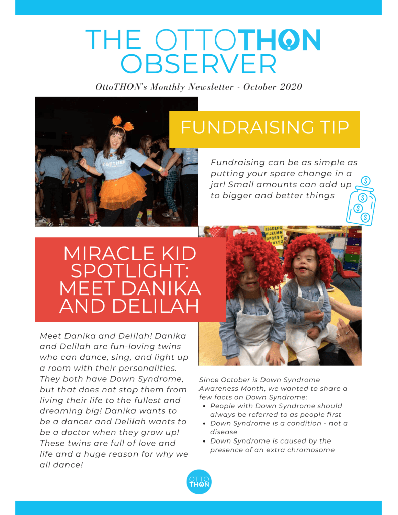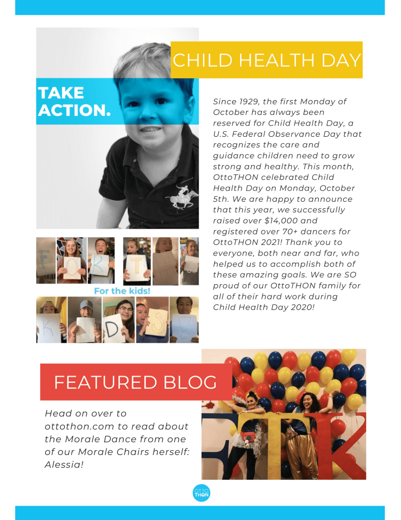 As external communications director, I worked with the dancer communications chair, Chris Bezdedeanu, to create a monthly newsletter to go out to all OttoTHON participants. Here’s an example from October 2020.