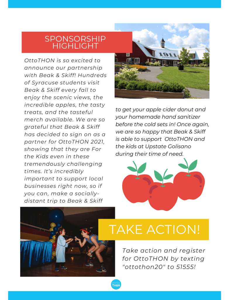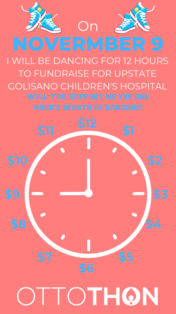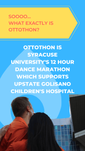 OttoTHON (Syracuse University’s Dance Marathon) is an organization at Syracuse University which works with Children’s Miracle Network Hospitals and Miracle Network Dance Marathon to put on an annual 12-hour dance marathon event that fundraises for the Upstate Golisano Children’s Hospital. OttoTHON also fundraises throughout the year through various activations and special events.