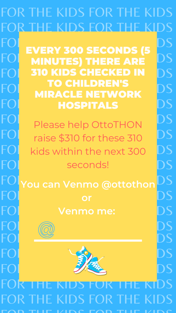 For OttoTHON’s 2021 event I was the external communications director. As a part of the team of directors, I was about of the decision to move our event from November to February, which resulted in better registration numbers, as people weren’t plagued by the stress of finals and the holidays around the same time as dance marathon.