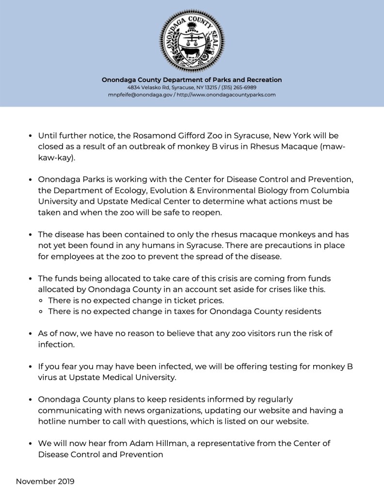 In this assignment, I played the role of a representative from the Onondaga Department of Parks and Recreation. I was given a scenario where there was an outbreak of monkey B virus in the Rhesus Macaque monkeys at the zoo. I put together these talking points that someone could hypothetically use in this scenario.