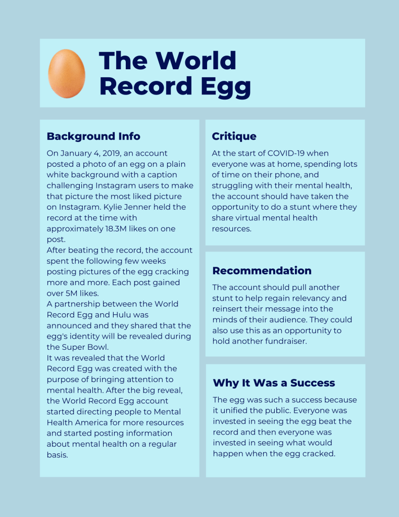 - Case Study: World Record EggRemember the World Record Egg back in 2019? The egg that became the most liked picture on Instagram and has held that title ever since? Did you know that breaking the record was part of a campaign? After breaking the world record, the account started posting photos of the egg starting to crack little by little. The account then announced that they would be revealing what’s inside the egg in a short clip on Hulu that was to be aired immediately following the Super Bowl. It turned out that the World Record Egg was a campaign for mental health awareness.